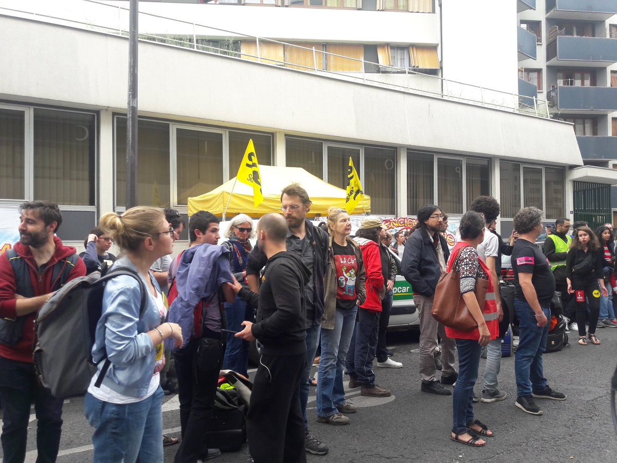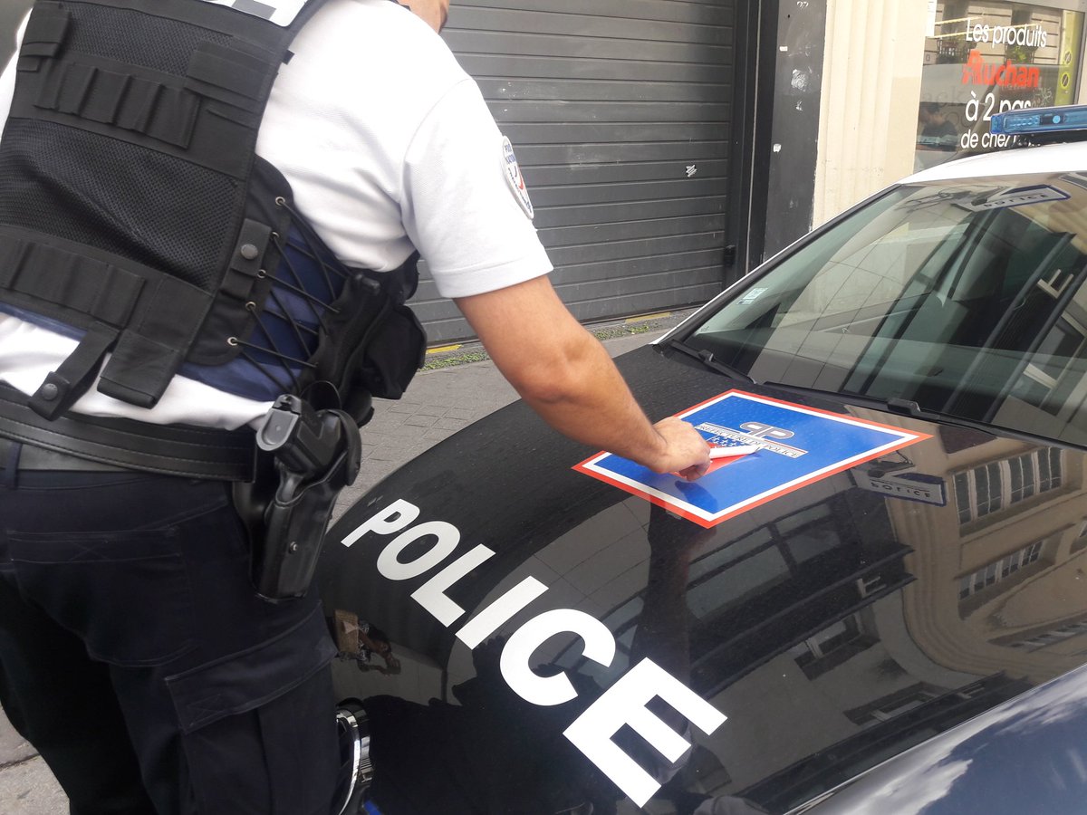 Les policiers enlèvent les autocollants du @NPA_officiel et de @sudposte92 collés sur leurs véhicules par les manifestants