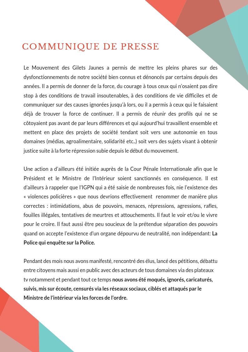 Rappelant les principales revandications des "gilets jaunes", ils promettent la création de leurs "propres organes de contrôle citoyens", leurs "propres médias", leurs "propres circuits d'approvisionnement en agroalimentaire" ou encore leurs "propres établissements d'épargne éthique".