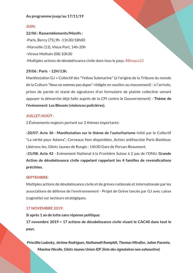 Ce communiqué annonce également une série de manifestation entre juin et le novembre. "Dix-sept actions de désobéissance civile visant le CAC 40 dans tout le pays" sont notamment prévues le 17 novembre, date du premier anniversaire du mouvement des "gilets jaunes", s'il reste "sans réponse" après "un an de lutte".