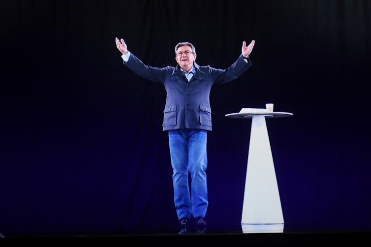 Une innovation durant la campagne présidentielle : l’hologramme de Jean‑Luc Mélenchon, le 12 avril 2017, lors d’un meeting à Montpellier. Anne-Christine Poujoulat / AFP
