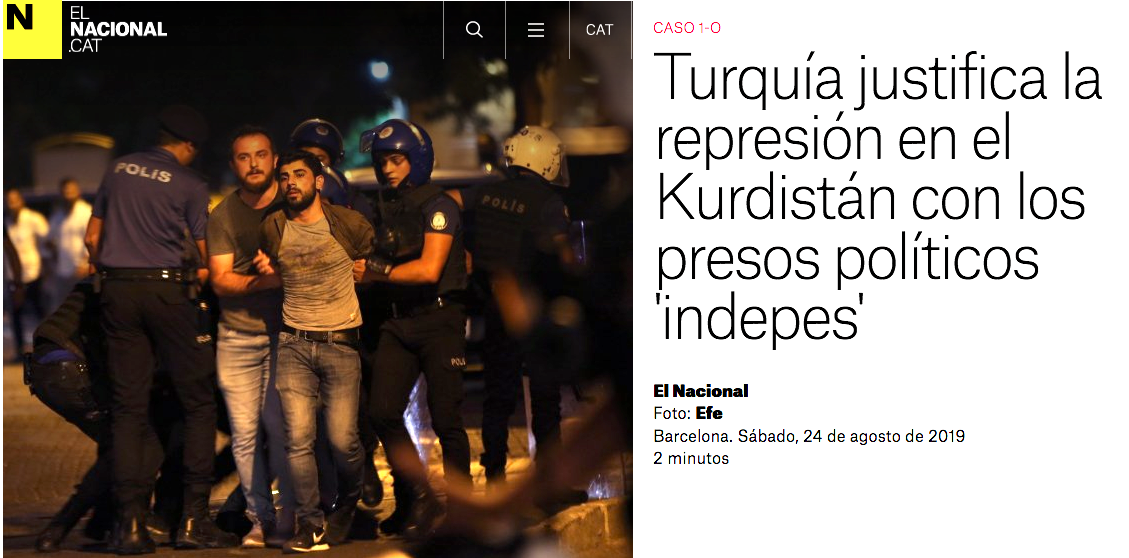 Article source Turquía justifica la represión en el Kurdistán con los presos políticos 'indepes' (La Turquie justifie la répression au Kurdistan en invoquant les prisonniers politiques indépendantistes [catalans]), El Nacional