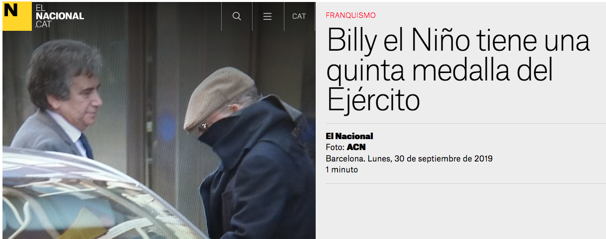 Mais, pardon, pourquoi en effet parler de franquisme ? Parce qu’on découvre, en même temps que le reste, que le célèbre tortionnaire de ce temps « révolu », Billy el Niño, dégustant, lui, une liberté pleine et entière, bénéficie depuis 1977 (Franco est mort depuis 2 ans et la Transition vers la démocratie est largement en cours), en plus de l'impunité politique due au bras armé de la dictature, d’une 5e médaille militaire (pour services rendus ?) : décoration plus qu’honorifique car, toutes médailles cumulées, notre brave homme en retire une pension bonifiée de 50% que la démocratie espagnole entérine toujours en ce jour de dénonciation du terrorisme catalan ! (lire ici) ?