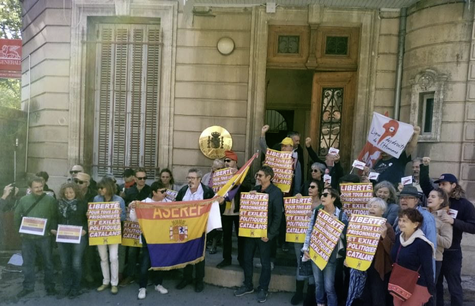 Nous étions près de 80 personnes à nous retrouver aujourd’hui aux abords du Consulat d'Espagne de Montpellier pour protester contre les terribles condamnations des prisonniers politiques indépendantistes de Catalogne. Nous avons décidé de pénétrer dans ce bout d'Etat espagnol pour y signifier tout ce que ces sentences iniques nous inspirent.