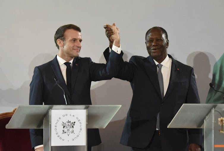 Les présidents français Emmanuel Macron et ivoirien Alassane Ouattara à Abidjan le 21 décembre 2019. Sia Kambou/AFP