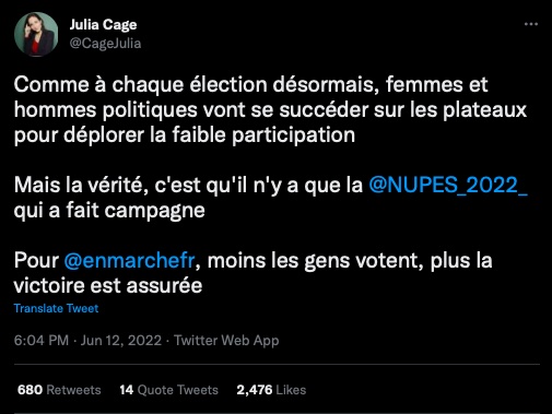 Et de fait, pas sûr que les Macronistes soient très pressés de voir revenir aux urnes des populations en rupture avec le système électoral. La NUPES et l’extrême droite, en revanche, auraient probablement tout intérêt à voir ces révoltés se remettre à voter, car il est probable qu’ils appelleraient de leurs voeux des changements radicaux de société. D’ou les tentatives de la NUPES et du RN d’inciter ces déclassés politiques à renouer avec le système électoral.