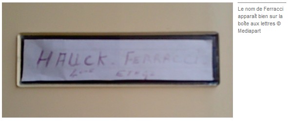 Sauf qu'à la lecture de l'article de Mediapart, difficile de savoir qui est exactement le locataire du 20 rue du Cirque :"L’appartement où se retrouvaient François Hollande et Julie Gayet a été prêté à cette dernière par une amie actrice, Emmanuelle Hauck. Il est toujours au nom de l’ancien mari de celle-ci et père de ses enfants : Michel Ferracci", écrit le site d'information. "Au nom de" ? Une formule floue que justifie ainsi Mediapart : le nom de Ferracci apparaît "dans les Pages blanches de La Poste à l’adresse indiquée et sur la boîte aux lettres de l'immeuble" (photo à l'appui).